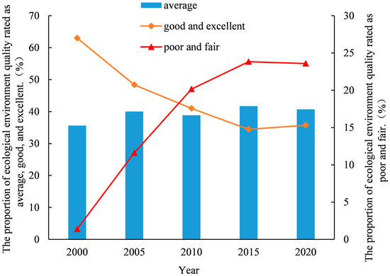 The following results are illustrated in Figure 5. In 2000, the area of the LRB where the EEQ was rated good or excellent measured 3676.22 km², taking up 62.99% of the total area; in 2005, the corresponding area was 2822.19 km², with a proportion of 48.36%; in 2010, it was 2391.88 km², accounting for 40.99%; in 2015, it was 2010.67 km², making up 34.45%; in 2020, the area of the LRB in which the EEQ rated was good or excellent was 2083.89 km², making up 35.71% of the total area. During the period from 2000 to 2020, the combined area of good and excellent regions witnessed a reduction of 1592.33 km², corresponding to a percentage decline of 27.28%. In 2000, the combined area of the LRB with poor and fair EEQ ratings was 80.81 km², representing 1.39% of the overall area; by 2005, this area had increased to 678.87 km², accounting for 11.63% of the total; in 2010, it further rose to 1176.80 km², constituting 20.16% of the total area; in 2015, the area reached 1390.00 km², making up 23.82% of the total; in 2020, it was 1375.91 km², equivalent to 23.58% of the total area. Over the 20-year span, the area of poor and fair regions expanded by 1295.10 km², with a percentage increase of 22.19%. Thus, from 2000 to 2020, the proportion of good and excellent EEQ in the LRB exhibited a downward trajectory, while that of poor and fair EEQ showed an upward inclination, whereas the proportion of the average ecological grade remained relatively stable.