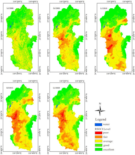 With reference to the previous standards, when normalizing the EEQ value between 0 and 1, grading with a level interval of 0.2 can better express the EEQ status [37,38]; therefore, in order to conduct a more in-depth analysis of the representativeness of the RSECI, we divided the results of the RSECI calculation of EEQ into “poor, fair, average, good, and excellent”, with 0.2 as the grade interval. Simultaneously, the area and proportion of each ecological class of the RSECI in the five years of 2000, 2005, 2010, 2015, and 2020 were statistically analyzed, the results of which are shown in Table 1. According to the proportion of each grade, the area of the good (0.6~0.8) RSECI level in 2000 was 3337.43 km2, with the largest percentage of 57.19%. In 2005, 2010, 2015, and 2020, the percentages of the average (0.4~0.6) RSECI grade were the highest, at 40.01%, 38.85%, 41.73%, and 40.71%, respectively. The area percentage of excellent (0.8~1.0) RSECI grades increased from 5.80% in 2000 to 20.13% in 2010 and then decreased to 6.95% in 2020, showing an unstable trend of change. The proportion of poor (0~0.2) grades increased, from 0.09% in 2000 to 2.52% in 2020, showing a gradually increasing trend. The proportion of fair (0.2~0.4) grades increased from 1.30% in 2000 to 21.06% in 2020, an increase of 19.76%, with a gradually increasing trend.