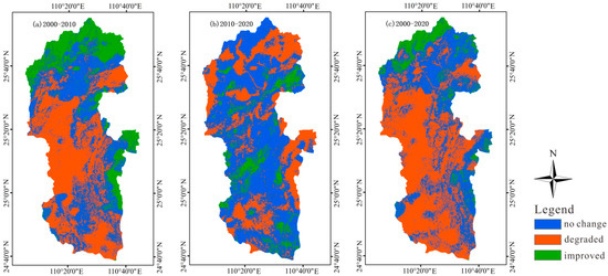 Dynamic changes in the ecological environment quality of the Lijiang River Basin from 2000 to 2010 (a), 2010 to 2020 (b), and 2000 to 2020 (c).