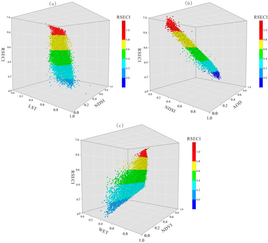The 3D scatter plots of feature spaces: (a) 3D space for LST, NDSI, and remote sensing ecological comprehensive index (RSECI); (b) 3D space for NDSI, AOD, and RSECI; and (c) 3D space for WET, NDVI, and remote sensing ecological comprehensive index (RSECI).