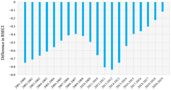 The specific calculation steps of the difference in the RSECI are as follows: (1) Based on the RSECI data from the LRB in 2000, 2005, 2015, and 2020, the RSECI data of other years from 2000 to 2020 were obtained using cubic polynomial interpolation based on a python platform. Cubic polynomial interpolation is a commonly used numerical analysis technique, utilizing a polynomial function of degree three to approximate the relationship between data points; in this case, it takes advantage of the known RSECI data from specific years to estimate the values for the intervening years, a method which shows relative accuracy in capturing the trend and variation patterns in data within a certain range, and which can be used to effectively fill in the gaps from missing data and provide a more continuous and comprehensive dataset for further analysis. (2) Calculation of the difference, as follows: