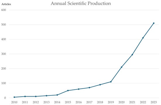 Filter 1. Keyword search: First, a keyword search was performed in the Scopus database, which proved particularly good in previous work [14]. The defined criteria can be found in Table A1 and Table A2 in the Appendix A. The output of 3099 articles was analyzed using R package bibliometrics 4.0.0.