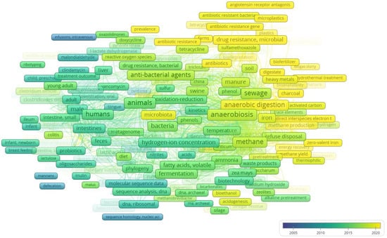 A co-occurrence map of scientific papers containing the following keywords: anaerobic digestion, digestate, antibiotic/antimicrobial/drug/heavy metal, and residue/degradation/concentration/ content. The frame size represents the frequency of the keyword’s co-occurrence, and the color of clusters denotes the publication date. The map was created in VOSviewer (v1.6.16; 2020; Center for Science and Technology Studies, Leiden University, the Netherlands).