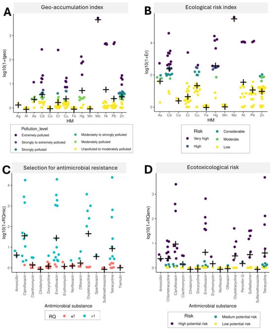 Ecological risk assessment of HMs and antibiotics detected in digestate based on the values of the geo-accumulation index (A), environmental risk factor (B), risk quotient (RQ) for selection for drug resistance in the environment (C), and ecotoxicity (D). The cross symbol indicates the average value.