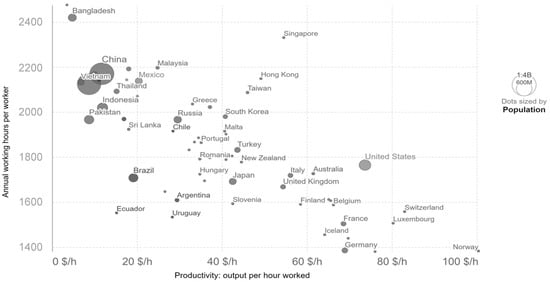 Empirical evidence suggests that reduced working hours can enhance productivity and employment and, consequently, lead to an increase in real GDP []. Shorter workweeks boost productivity through the physiological benefits of less physical and mental fatigue, and organizational redesign []. Concerns about potential skill dilution and decreased productivity have been challenged by findings indicating that reduced hours can decrease labor costs and enhance workforce quality, as supported by evidence from the U.S. and Europe from 1995 to 2006 [,]. Countries with shorter working hours—such as Germany, Belgium, France, or the Netherlands—exhibit higher productivity rates, underscoring a positive correlation between reduced annual work hours and productivity. Figure 1 further illustrates this trend, with European nations leading in productivity as work hours decrease.
