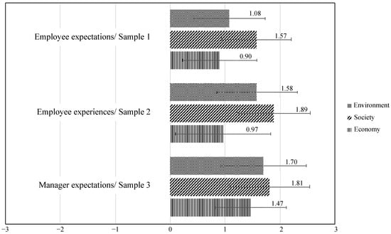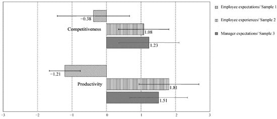 Regarding the implications of reducing the weekly working hours for competitiveness and productivity, the participants were asked whether it would increase or decrease. The participants differ in their perceptions (Figure 2). When it comes to the competitiveness of companies, participants in sample 1 (employees’ expectations) hold differing expectations from other samples. They anticipate a decrease, whereas the remaining participants consider that competitiveness has increased or expect it to increase (F (2, 143) = 12.42, p < 0.001). A similar pattern emerges regarding the impact on companies’ productivity. While the participants in sample 1 anticipate a decrease in productivity, the participants in sample 2 report an increase. Additionally, managers anticipate a positive effect on company productivity from the reduction of working hours (F (2, 143) = 71.51, p < 0.001).