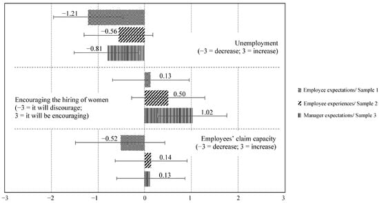 Effects of reducing work hours for unemployment, the hiring of women, and employees’ claim capacity. Note: −3 = decrease; 3 = increase. Sample 1: employee expectations; sample 2: employee experiences; sample 3: manager expectations.