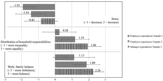 Effects of reducing work hours for stress, the distribution of household responsibilities, and work–family balance. Note: −3 = decrease; 3 = increase. Sample 1: employee expectations; sample 2: employees experiences; sample 3: manager expectations.