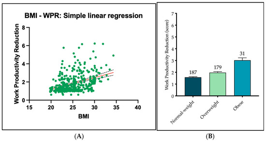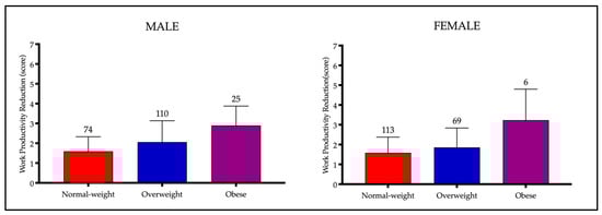 Figure 2 shows a general trend indicating that higher BMI values are associated with increased work productivity reduction (WPR), aligning with the findings from the linear regression analysis and Pearson’s correlation calculation. Among males, the strongest association is observed in overweight individuals, whereas in females, the relationship is most pronounced among obese individuals.