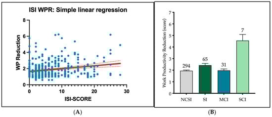 Similarly, in our study, a reduction in work productivity was found in subjects with a high degree of insomnia, with a directly proportional correlation between the ISI score and work productivity reduction. Insomnia—characterized by difficulty falling asleep or staying asleep or experiencing non-restorative sleep—affects a significant portion of the working population. The ISI score, a clinical assessment tool, measures the nature, severity, and impact of insomnia. The relationship between insomnia, as measured by the ISI score, and work productivity is complex, involving direct and indirect pathways through physical and mental health, cognitive function, and broader socioeconomic implications.