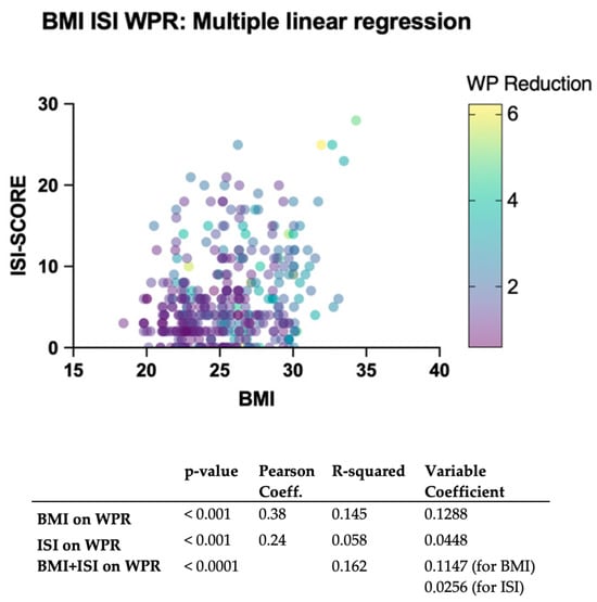 Subsequently, a multiple linear regression analysis was conducted to evaluate the joint impact of BMI and ISI variables on WPR.