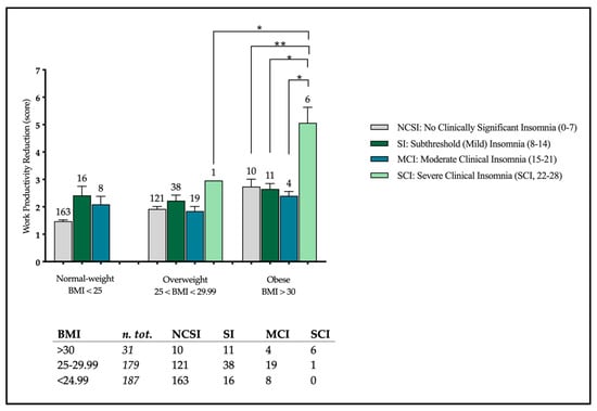 p < 0.0001] in work productivity reduction when comparing subjects with different BMI and ISI-score categories. Specifically, Tukey’s post hoc test highlighted a significant work productivity reduction in subjects with SCI compared to those with NCSI, SI, and MCI (q = 5.431,