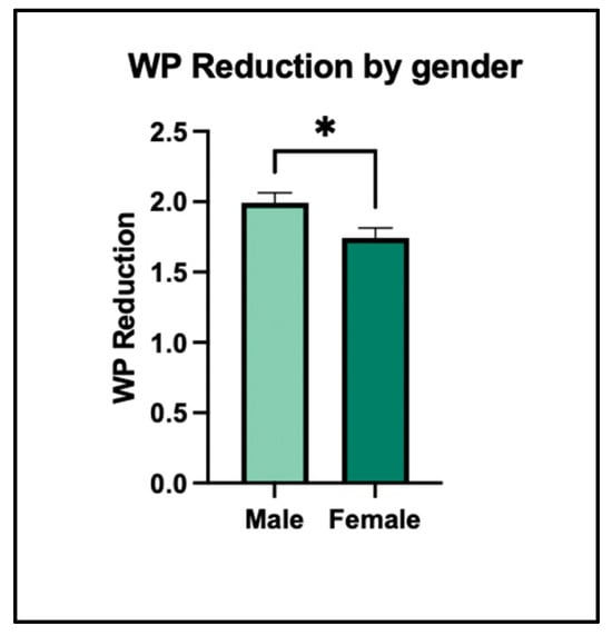 Analysis of the results obtained from the WPAI scores revealed that the entire sample missed 13,939 h of work due to illness (males: 7755 h (55.53%); females: 6184 h (44.46%)), representing 2.92% of the total working hours to be completed.