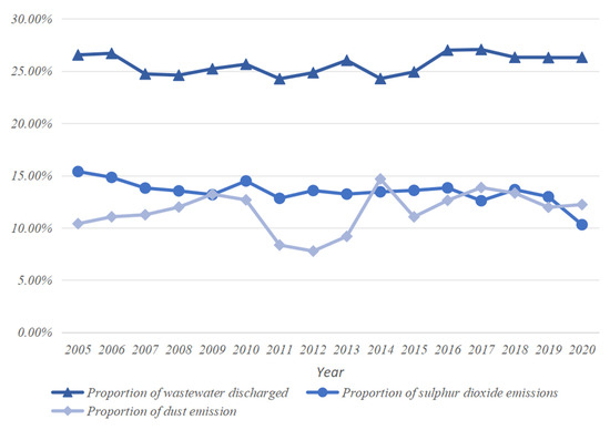 Proportion of wastewater, sulfur dioxide, and dust emissions in the YRD region relative to national totals.