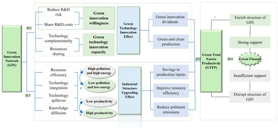 From a micro perspective, the high costs, risks, and dual externalities of green technology innovation often lead to a lack of motivation among individual innovation entities. The GIN mitigates this challenge by integrating resources from all participants, reducing individual R&D costs and risks, and enhancing the feasibility and willingness for green technology innovation [28]. Additionally, the GIN optimizes the environment for technology flow and sharing, facilitating the effective diffusion of knowledge and technology and improving the overall level of urban green technology innovation [29]. Green technology innovation not only reduces pollution emissions during production but also generates economic benefits through innovation dividends, supporting the dual improvement of GTFP.