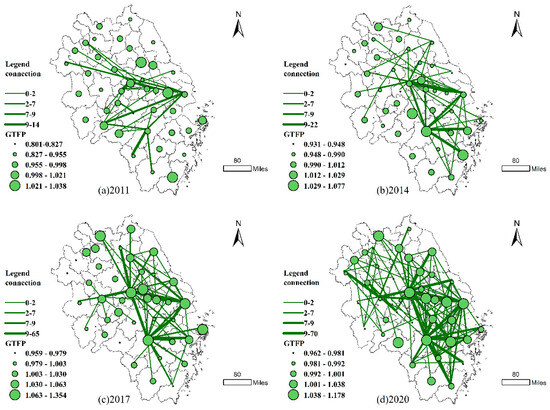 In response to the challenges of sustainable development, the Chinese government has prioritized the integrated development of green innovation in the YRD region. As part of this effort, green innovation cooperation activities have been steadily increasing. The Outline of the Plan for the Integrated Development of YRD Region, issued in 2019, emphasizes the principles of innovation, co-construction, and green development. This policy framework has facilitated the seamless flow of resources across cities in the YRD region, thereby strengthening inter-city cooperation and exchanges. A notable outcome of this enhanced collaboration is the substantial growth in green patents generated through inter-city cooperation. According to Figure 2, the proportion of green cooperative patents relative to total cooperative patents in the YRD region increased from 9.20% in 2011 to 16.06% in 2020, reflecting significant progress. This rise in green-authorized cooperative patents indicates that the GIN is evolving into a robust and complex structure, providing a solid foundation for examining the relationship between the GIN and GTFP [5].