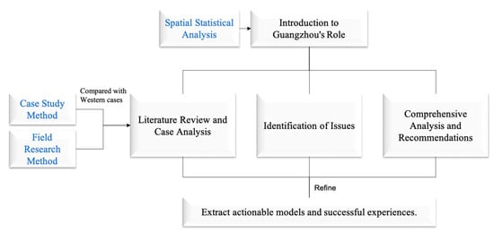 This paper not only finds out the differences between Chinese and Western theories and cases but also provides empirical evidence for further research. By specifically analyzing the urban renewal pathways of Guangzhou’s cultural industry, it extracts actionable models and successful experiences for further promoting the cultural industry’s role in urban renewal and high-quality urban development in China (Figure 1).