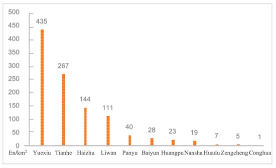 In Guangzhou, cultural enterprises are primarily concentrated in the four central districts. In terms of distribution density, these central districts have a significantly higher density of cultural enterprises compared to the outer urban areas (Figure 2). Among these districts, Yuexiu and Tianhe have the highest density of cultural enterprises, with 435 en/km2 and 267en/km2 (en/km2: enterprises per square kilometer), respectively, followed by Haizhu and Liwan, where over 100 cultural enterprises are located within an average one-kilometer radius. In contrast, outer districts such as Conghua, Huadu, and Zengcheng have much lower densities, with fewer than 10 cultural enterprises within the same distance. This disparity highlights the need for outer districts to further improve cultural industry infrastructure and optimize the industrial environment to foster the growth of cultural enterprises and encourage industry clustering effects.
