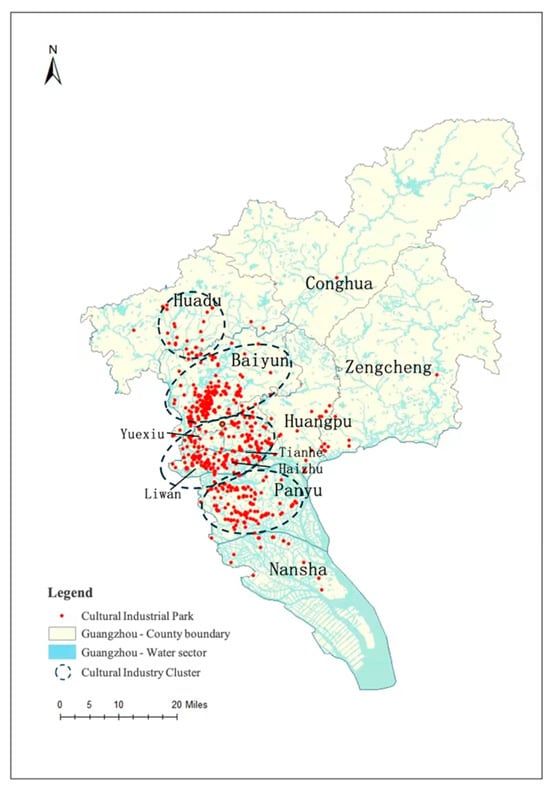 This pattern is closely related to the central districts’ well-developed infrastructure, mature commercial environment, and rich historical and cultural heritage. A more significant factor is that, due to limited land resources in the central districts, many old industrial buildings have been transformed into cultural industry parks through urban renewal, further promoting the growth of cultural industries. Additionally, districts adjacent to the central area, such as Baiyun, Panyu, and Huangpu, are also experiencing a clustering of cultural industry parks, indicating that Guangzhou’s cultural industry is gradually expanding toward peripheral areas. In contrast, outer districts, like Huadu and Nansha, have relatively delayed development in cultural industry parks, with more sparse distribution. In the future, it will be essential to unlock the cultural industry development potential of these outer areas, transforming them into key regions for the outward expansion of cultural production and manufacturing, supported by policy guidance and infrastructure improvements (Figure 3).