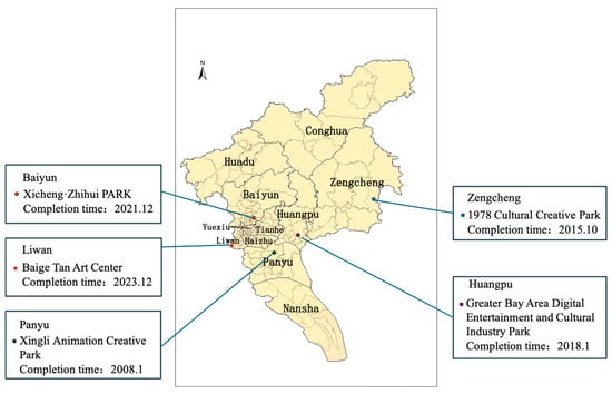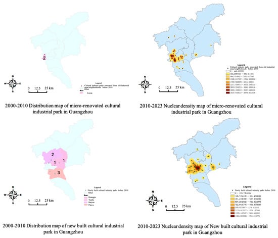 This paper analyzes the spatial distribution and evolution of typical micro-renovation and newly built cultural industry parks based on the “100 Parks Tour” of Guangzhou’s Bureau of Culture, Radio, Television, and Tourism, which selected 102 representative cultural industry parks in Guangzhou (2024). As illustrated in Figure 4, newly built cultural industry parks were initially concentrated in the central urban areas of Guangzhou but have gradually expanded to the peripheral regions since 2010. By utilizing land resources in the outer districts, these parks meet the development needs of cultural manufacturing and emerging cultural technology industries, while avoiding the over-concentration of cultural resources and economic activities in the city center.