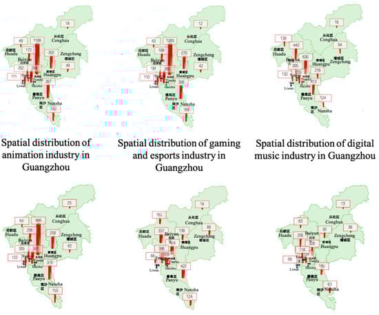 An analysis of the spatial distribution characteristics of Guangzhou’s digital cultural industry reveals a trend of central concentration, with gradual expansion toward the peripheral urban districts. Digital cultural enterprises are now present in all districts (Figure 5), with Tianhe District serving as the central hub for the digital cultural industry development, attracting a large concentration of digital cultural enterprises. Currently, Tianhe’s digital cultural industry has ranked first in overall strength in the city for 10 consecutive years, with its gaming industry accounting for about 40% of the national market share, making it one of Tianhe’s economic pillar industries.
