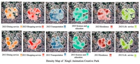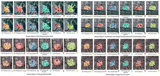 This paper selects five typical examples of cultural industry parks located in peripheral districts with varying distribution areas and construction times, including Xicheng·Zhihui PARK, Baige Tan Art Center, Xingli Animation Creative Park, 1978 Cultural Creative Park, and the Greater Bay Area Digital Entertainment and Cultural Industry Park. These parks exhibit unique characteristics, as shown in Table 3 and Figure 6. By comparing the kernel density distribution of surrounding amenities, such as dining services, shopping services, transportation infrastructure, scientific and cultural facilities, business and residential areas, and life services [30], we observe the impact of these parks on urban renewal follows a certain pattern, especially in terms of temporal and spatial effects (Figure 7).