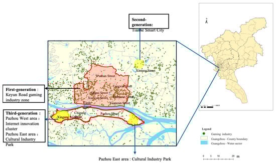 The third-generation gaming industry cluster is located within the Pazhou Artificial Intelligence and Digital Economy Pilot Zone. (Figure 10) The primary goal of this zone is to develop headquarters and cultural industry park clusters that focus on digital cultural creativity [35]. This area emerged from the demolition and reconstruction of Pazhou Village in the urban village. The total land area of the transformation spans 757,600 square meters, and it employs a comprehensive approach to the redevelopment of the old village.