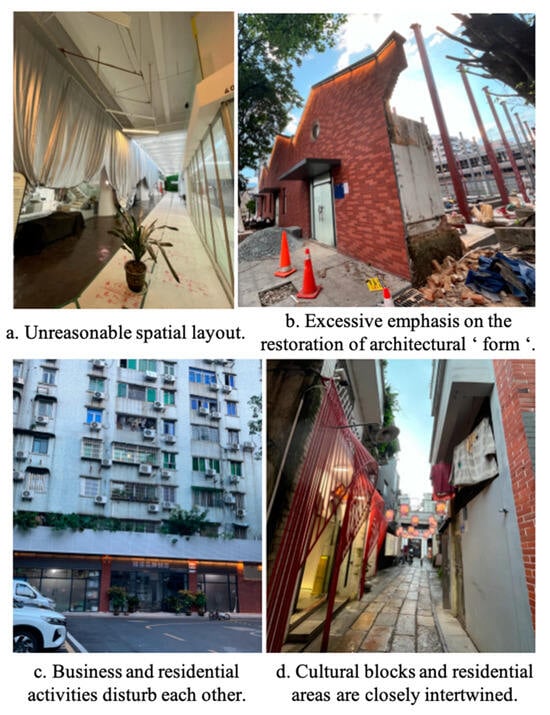 Moreover, urban renewal has exacerbated the problem of integrating cultural parks with surrounding residential areas. For instance, in the Guangzhou Xieshuang Innovation Workshop, the lower floors serve as creative office area, while the upper floors remain residential. This proximity creates conflicts between commercial activities and residents’ lives, making it difficult to achieve a balance between the two functions (Figure 11c). Similarly, in the Yongqingfang historical block, the blending of intangible cultural heritage displays with the daily residential life negatively impacts both the cultural experience of visitors and the expansion of the cultural industry (Figure 11d).