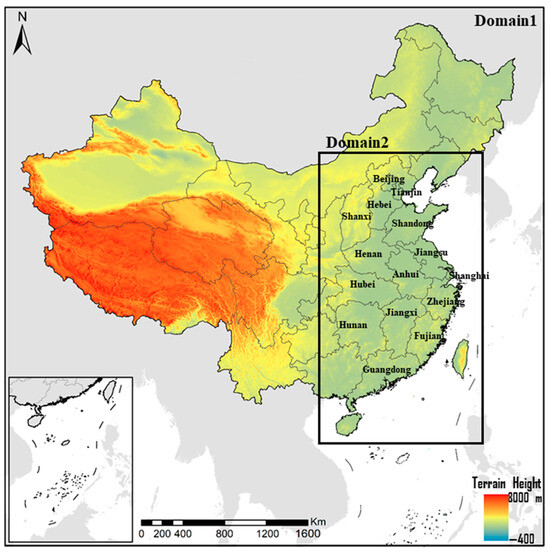 In this research, we utilized the WRF/CMAQ modeling system to assess the impact of the power sector on air quality in June 2019. Our study employed a nested grid approach: an outer domain covering China (27 km resolution) and an inner domain focusing on the eastern part of China (9 km resolution) (Figure 1).