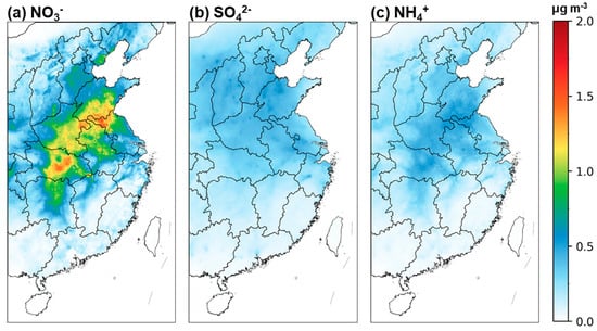 Contribution of power plant emission to the concentration of secondary components of PM2.5, including (a) contribution of power plant emission to the concentration of NO3−, (b) contribution of power plant emission to the concentration of SO42− and (c) contribution of power plant emission to the concentration of NH4+ in June 2019.