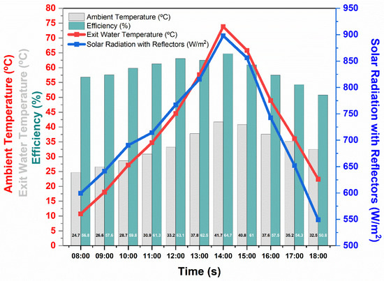The exit water temperature in the Ni-Co-coated panel with reflectors showed a substantial increase compared with the configuration without reflectors, as shown in Figure 5. Starting from an initial temperature of 39.7 °C at 08:00 a.m., the exit water temperature reached its peak at 67.3 °C at 2:00 p.m., following the peak of the incident solar radiation. This increase was approximately 7 °C higher than the peak temperature observed in the absence of reflectors, highlighting the impact of the additional solar radiation reflected on the absorber surface. The temperature profile indicates that the reflectors effectively increased the thermal absorption capacity of the Ni-Co-coated panel by concentrating more solar energy on the surface. This finding aligns with those of previous studies [36], which demonstrated that solar reflectors can significantly enhance the solar collector performance by increasing the solar flux received by the absorber. Additionally, the maximum outlet water temperature achieved with Ni-Co-coated plates and reflectors was 67.3 °C, which exceeds the range of 50–60 °C reported in systems using selective black paint coatings [38]. This demonstrates the potential of Ni-Co coatings to meet the thermal demands of high-temperature applications, such as industrial drying and sterilization processes. The elevated exit water temperature achieved with the reflectors confirms the suitability of the Ni-Co coatings for high-efficiency solar thermal applications when supplemented with additional reflectors.