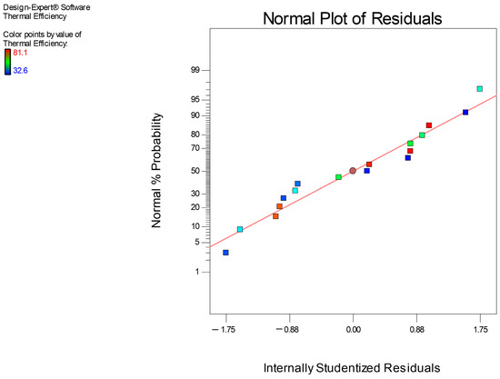 The normal plot of the internally studentized residuals, shown in Figure 6, reveals that the residuals are closely aligned with the reference line and are symmetrically distributed on both sides. This alignment indicated that the residuals were minimal, demonstrating a good fit with the quadratic regression model. This pattern in the residuals is an indication of the model’s accuracy in predicting thermal efficiency (Figure 7) without significant bias, further validating its suitability.