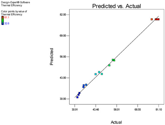 Table 9 presents the R-squared values of the quadratic model, which further validate its suitability for predicting thermal efficiency. The adjusted R-squared value of 0.9864 and the predicted R-squared value of 0.9439 were very close to each other, indicating a minimal deviation between the actual and predicted values. This close alignment demonstrates the robustness of the model and confirms its accuracy in predicting the thermal efficiency based on the selected process variables.