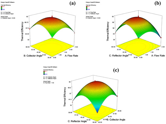 Response surfaces of interactions for nickel-cobalt-coated panel. (a) Flow rate vs. collector angle, (b) flow rate vs. reflector angle, (c) collector angle vs. reflector angle.