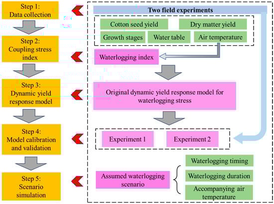 The flow chart of the present study is illustrated in Figure 3. After collecting the required experimental data, a coupling stress index was established to quantify the intensity of the combined stress of waterlogging and high temperatures. Afterward, based on this new stress index and a dynamic yield production model, we established an improved model for simulating cotton dynamic responses to the combined stress. Data from Experiment 1 and Experiment 2 were used for model parameter calibration and validation. Finally, a variety of waterlogging scenarios with different waterlogging timings, durations, and air temperature conditions was designed, and the determined yield production model was executed under these scenarios to examine its effectiveness in drainage practices.