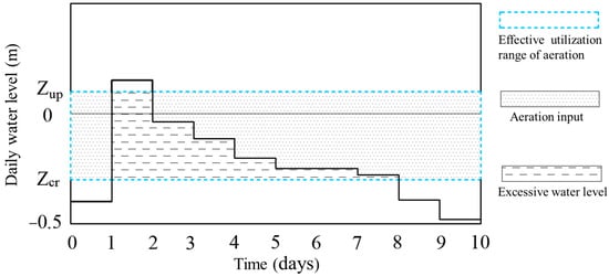 Schematic of the effective utilization range of soil aeration during an assumed 10-day waterlogging event. The stepped black line indicates the daily water level. The effective utilization range of soil aeration is illustrated by the blue dotted box. Zup and Zcr (m) are the upper and lower water level boundaries of the effective utilization range of soil aeration, respectively.
