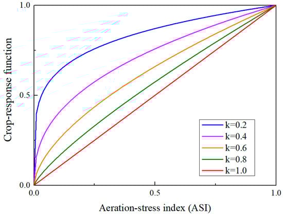 where k is an undetermined coefficient, which is able to describe the sensitivity of cotton dry matter growth to waterlogging stress at different stages. A high k value corresponds to great impairment by waterlogging stress on cotton dry matter growth at this stage. An illustration of this new crop-response function with various k values (k = 0.2, 0.4, 0.6, 0.8, 1) is shown in Figure 5.