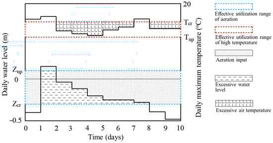 Schematic of the effective utilization range of high temperatures during an assumed 10-day waterlogging event. The lower portion of this figure is derived from Figure 4. The stepped black lines in the upper portion and the lower portion of this figure indicate the daily maximum temperatures and daily water levels, respectively.
