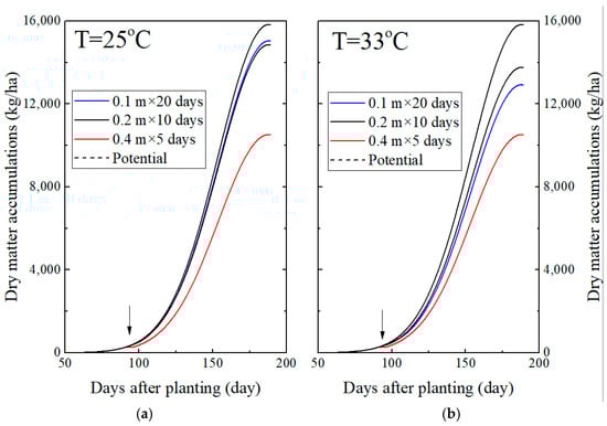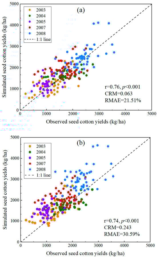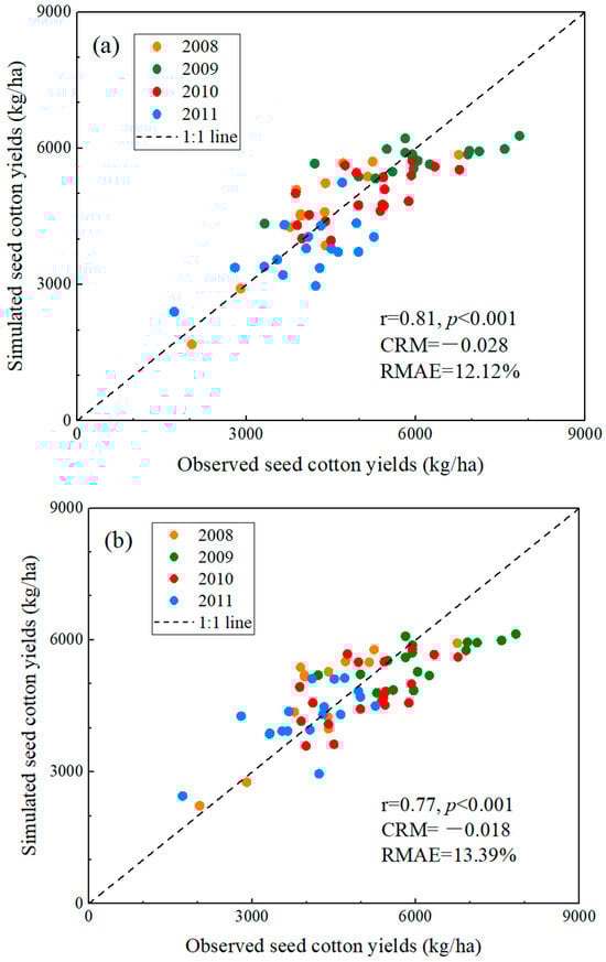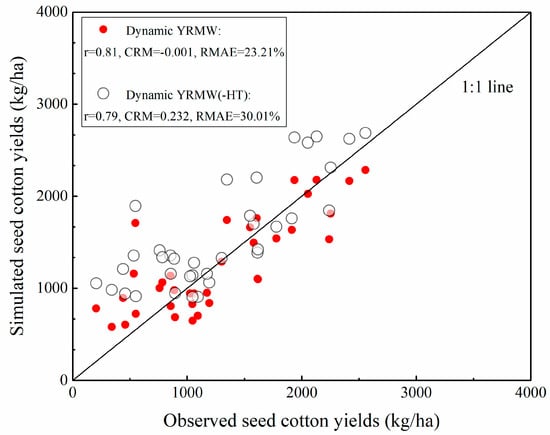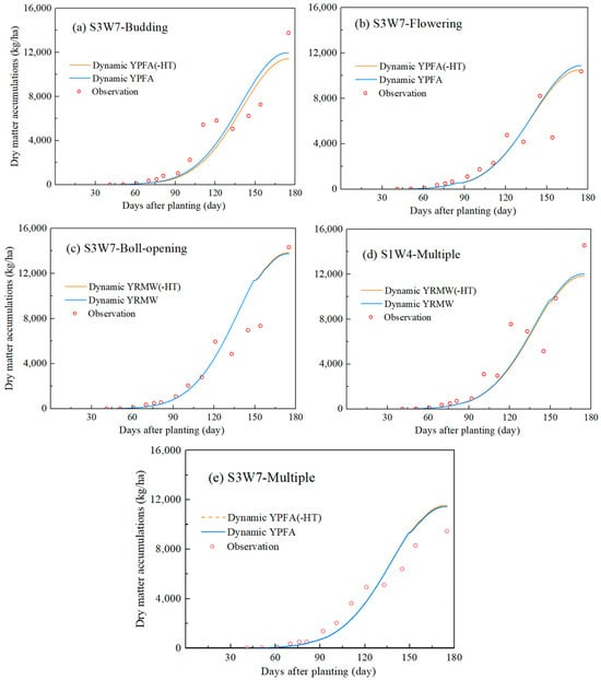 To investigate the efficacy of including the additional impact of accompanying high temperatures during modeling, in addition to the current dynamic YPFW, another version that disregarded the accompanying impact (named dynamic YPFW(-HT)) was also executed with the same database. The air temperature parameters, Tcr and Tup, were calibrated to 30 °C and 35 °C, respectively, because the best model performance was achieved with this combination. Meanwhile, the k values (Equation (9)) of the budding, flowering, and boll-opening stages were calibrated to 0.086, 0.120, and 0.340, respectively, in the dynamic YPFW and were calibrated to 0.191, 0.456, and 0.297, respectively, in the dynamic YPFW(-HT). This result demonstrates that including the impact of accompanying high temperatures in modeling could change the sequences of the growth-stage-specific coefficients. The seed cotton yield outcomes of the dynamic YPFW and the dynamic YPFW (-HT) during calibration are shown in Figure 7a,b, respectively; the relevant statistical indices are displayed in Table 5. In addition, as dynamic cotton DMAs over time were observed in several treatments in 2010 of Experiment 2, the dynamic outputs of cotton DMAs were compared with the observations, and the result is shown in Figure 8.