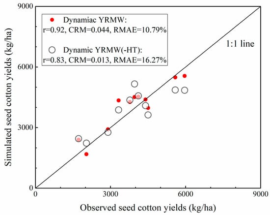 The seed cotton yield outcomes of the dynamic YPFW (a) and dynamic YPFW (-HT) (b) after calibration.