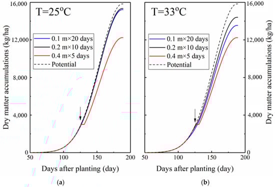 where Zup is a constant of water level (m), which represents the upper boundary of the effective utilization range of aeration. In this study, Zup was set as 0.1 m since 0.1 m is the maximum value of the water levels in the experiments [26]. Zac is the actual water level (m). The value of Zac is positive when ponded water exists; otherwise, it is negative. Zcr is a constant of underground water level (m), above which crop dry matter growth would be impeded by waterlogging (or submergence). According to the widely used drainage index SEW30 (the sum of excessive water table within 30 cm of the soil surface, [19,34,38] the Zcr value was set to −0.3 m. As a result, the (Zup − Zac) in Equation (7) indicates the soil aeration input, which is marked by ‘Aeration input’ in Figure 4.