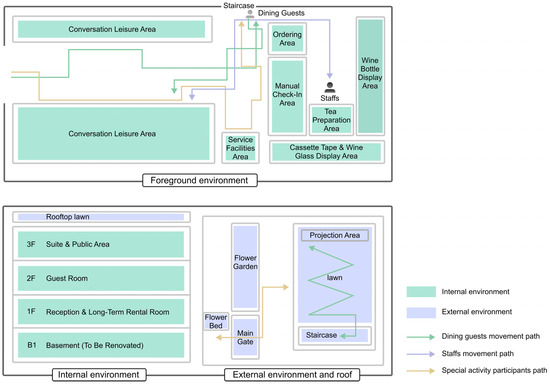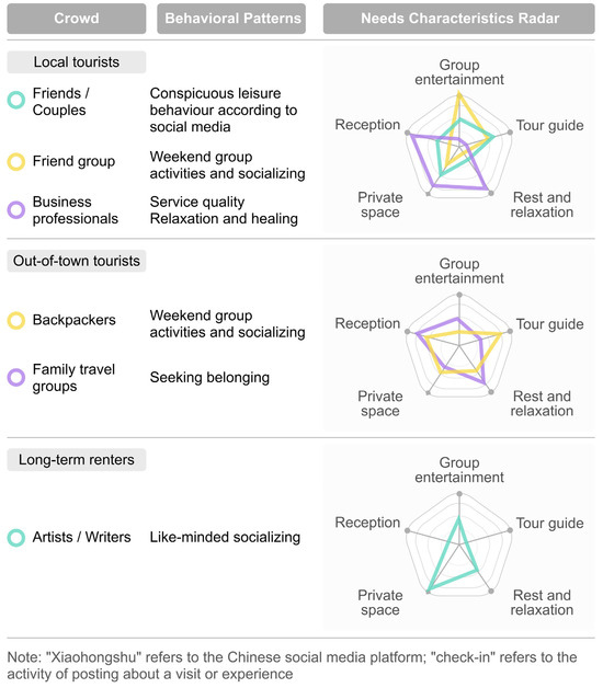 Interviews with three staff members were conducted to understand the types and needs of the current SELs’ end-user groups, which include local tourists, out-of-town tourists, and long-term renters, as illustrated in Figure 4. Overall, local tourists constitute the primary audience, with specific demands for group entertainment, guided tours, relaxation therapy, private spaces, and reception services. These groups exhibit certain demographic and need variations, with the core service users being friend groups, couples, or backpackers, each seeking different experiences: group activities for socializing on weekends, conspicuous leisure behavior according to social media (e.g., posting about a visit for platforms such as Xiaohongshu), and local culture and social belonging. The secondary core group consists of artists or writers who seek like-minded individuals for social interaction. In contrast, business professionals, out-of-town couples, and family tourist groups represent the weakest service connections, with their primary motivations being high-quality relaxation and family-oriented activities. Interviews with staff also revealed that the core user group consists of young individuals attracted to local social activities through social media, further refining the core service demographic.