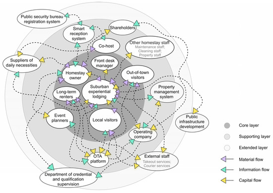 Furthermore, a summary of the relationships between the aforementioned end-users and existing service providers involved in ST services is presented through a stakeholder map (see Figure 5). The value chain comprises three primary types of relationships: material, informational, and financial. The roles are distributed across different levels of interest within SELs, specifically core, supportive, and expansive. The most closely connected roles include homestay owners, various user types (including youth), and activity organizers. These stakeholders directly engage in activities and aspects of the homestay and ST services that are more relevant, such as the technology reception system and the online travel agency platform as physical touchpoints, along with other staff members within the homestay serving as interpersonal touchpoints to support the service collectively. The expansive layer includes a broader group of service providers within the more extensive social support system.