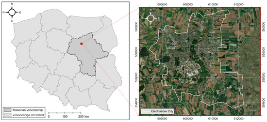 The area of research was the city of Ciechanów, located in the north-western part of the Masovian Voivodeship, less than 100 km north of Warsaw—the capital of Poland (Figure 1). Covering an area of 32.78 km2, the city is a county seat. Since 2005, a decrease in the number of its inhabitants has been observed [51]. The municipal authorities engage in several revitalization activities, trying to reverse negative trends resulting from the outflow of population and coping with related socio-economic problems.