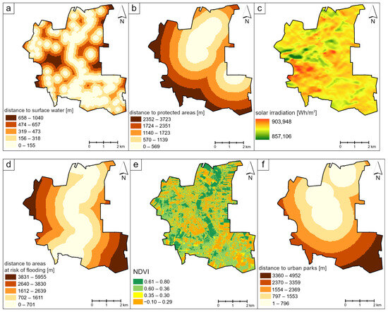 The distance of a potential site from protected areas (Figure 3b) was also considered. The analyses took into account the distances from ecological sites and landscape and nature complexes. According to the Ciechanów Environmental Protection Program, in force until 2022, the valley of the Łydynia River is the most valuable landscape and natural element of the city, performing important climatic functions, and also determining the natural, environmental, and recreational conditions in the city. In the literature, it is assumed that up to 500 m is the most favorable distance, corresponding to the length of a short walk, and such a distance of a green area from protected areas can be considered highly suitable.