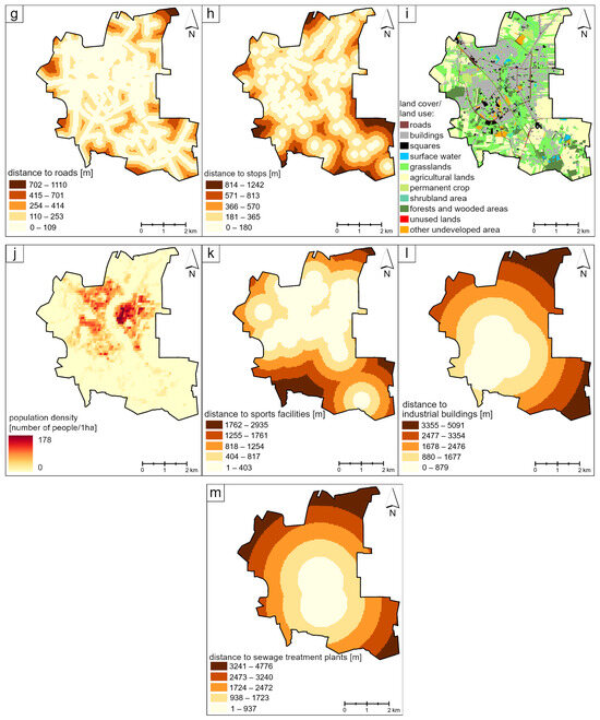 Factors important for determining the location of urban parks in Ciechanów. (a)—distance to surface water; (b)—distance to protected areas; (c)—solar irradiation; (d)—distance to areas at risk of flooding; (e)—NDVI; (f)—distance to urban parks; (g)—distance to roads; (h)—distance to stops; (i)—land cover/land use; (j)—population density; (k)—distance to sports facilities; (l)—distance to industrial buildings; (m)—distance to sewage treatment plants.