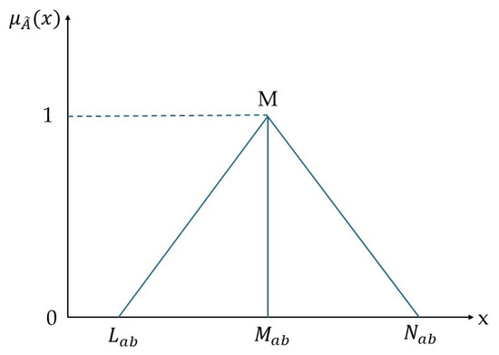 The fuzzy analytic hierarchy process (F-AHP) is a variation of the traditional AHP, which was introduced by Saaty in 1980. This method is used for multi-criteria decision-making (MCDM) and helps rank various significant factors in a specific domain. Fuzzy AHP employs fuzzy numbers to capture the uncertainty in human judgments when comparing different criteria. These numbers are stored in fuzzy pairwise comparison matrices. To begin, the weights are determined from these matrices using one of several algorithms. Zadeh [65] was the pioneer in introducing fuzzy logic, which enables the application of partial truth rather than strictly binary values. In a deterministic framework, decisions are constrained to binary options of 0 or 1, whereas fuzzy logic permits a spectrum of values between them to express ‘partial truth’. To quantify this partial truth, a membership function is employed to capture the system’s fuzziness [67]. This function was constructed using triangular fuzzy numbers (TFNs), which involve substituting exact values in the decision matrix with fuzzy ones. In the AHP decision matrix, each number is replaced by three values: l, m, and u, representing the lower, middle, and upper bounds. Figure 4 illustrates a TFN (triangular fuzzy number) function, expressed as E = (Lab, Mab, Nab), and is defined as follows: