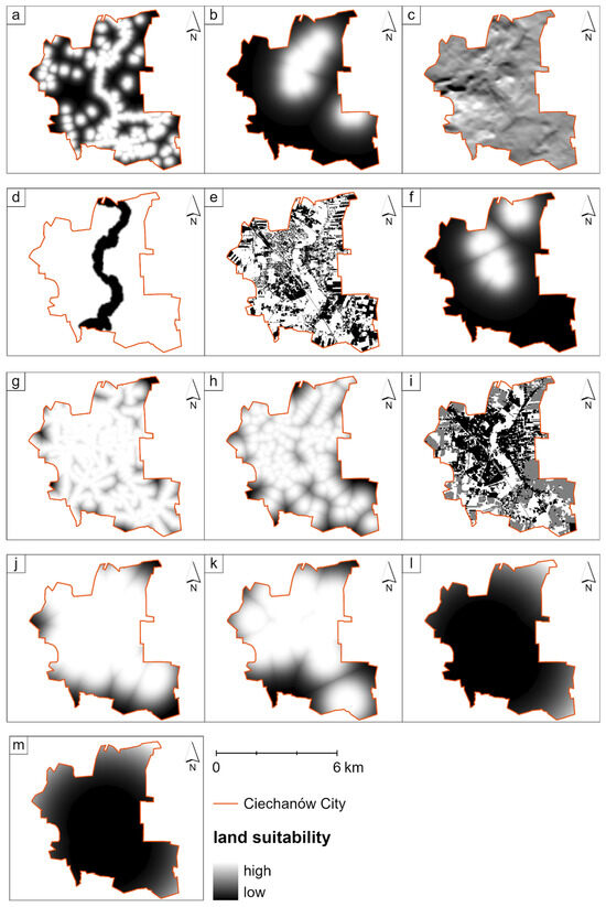 Results of fuzzy logic methods (based on: (a)—distance to surface water, (b)—distance to protected areas, (c)—solar irradiation, (d)—distance to areas at risk of flooding, (e)—NDVI values, (f)—distance to existing urban parks, (g)—distance to roads, (h)—distance to stops, (i)—land cover/land use, (j)—population density, (k)—distance to sports and recreational facilities, (l)—distance to industrial building, (m)—distance to sewage treatment plants).