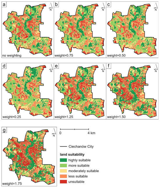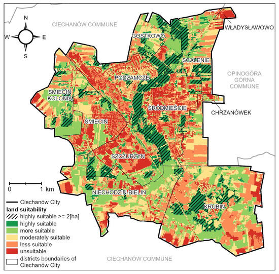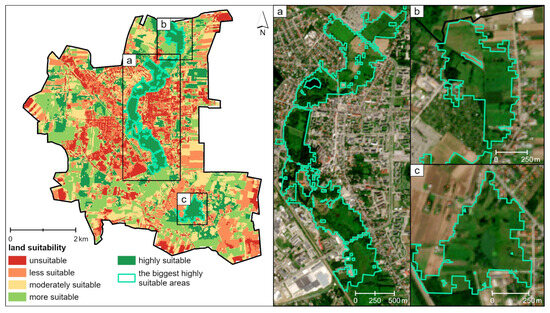 The proposed methodology takes into account the characteristics of the studied area (among others, nuisance factors) and minimizes the influence of subjectivity in determining the potential elements of green infrastructure. Furthermore, the research was enriched by a sensitivity analysis of the land suitability assessment results, as well as an analysis of the obtained results in relation to the phenomenon of the urban heat island.