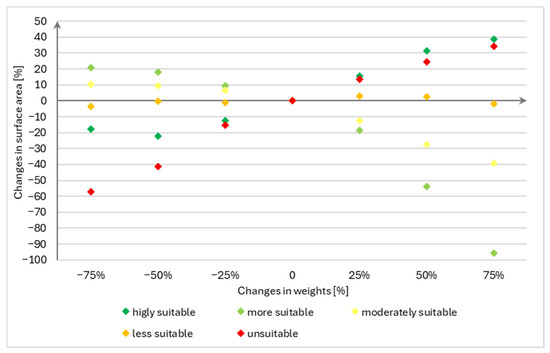 The sensitivity analysis of the urban park siting criteria system involves evaluating a limited set of RPCs (Relative Percentage Changes) with discrete percentage changes, starting from the original base data. As outlined by Ustaoglu and Aydinoglu (2020) [23], the RPC range for this study was set at ±75%, meaning that the weights could vary between −75% and +75% of their initial values. The results must ensure that the total sum of all criterion weights remains 1. Following the approach of Saatsaz et al. (2018) [78], the criteria with the highest standard weights were selected for the sensitivity tests. Consequently, the land-use factor, which had the highest weight, was the focus of the sensitivity test in this study. In a manner consistent with Saltelli et al. (2010) [77], a 25% variation in the IPC of the standard weights was consistently observed, showing that the original weights fluctuated by 25% at each step. The weights were adjusted by ±25%, ±50%, and ±75% over six iterations, with the other weights adjusted proportionally each time the main weight was modified.